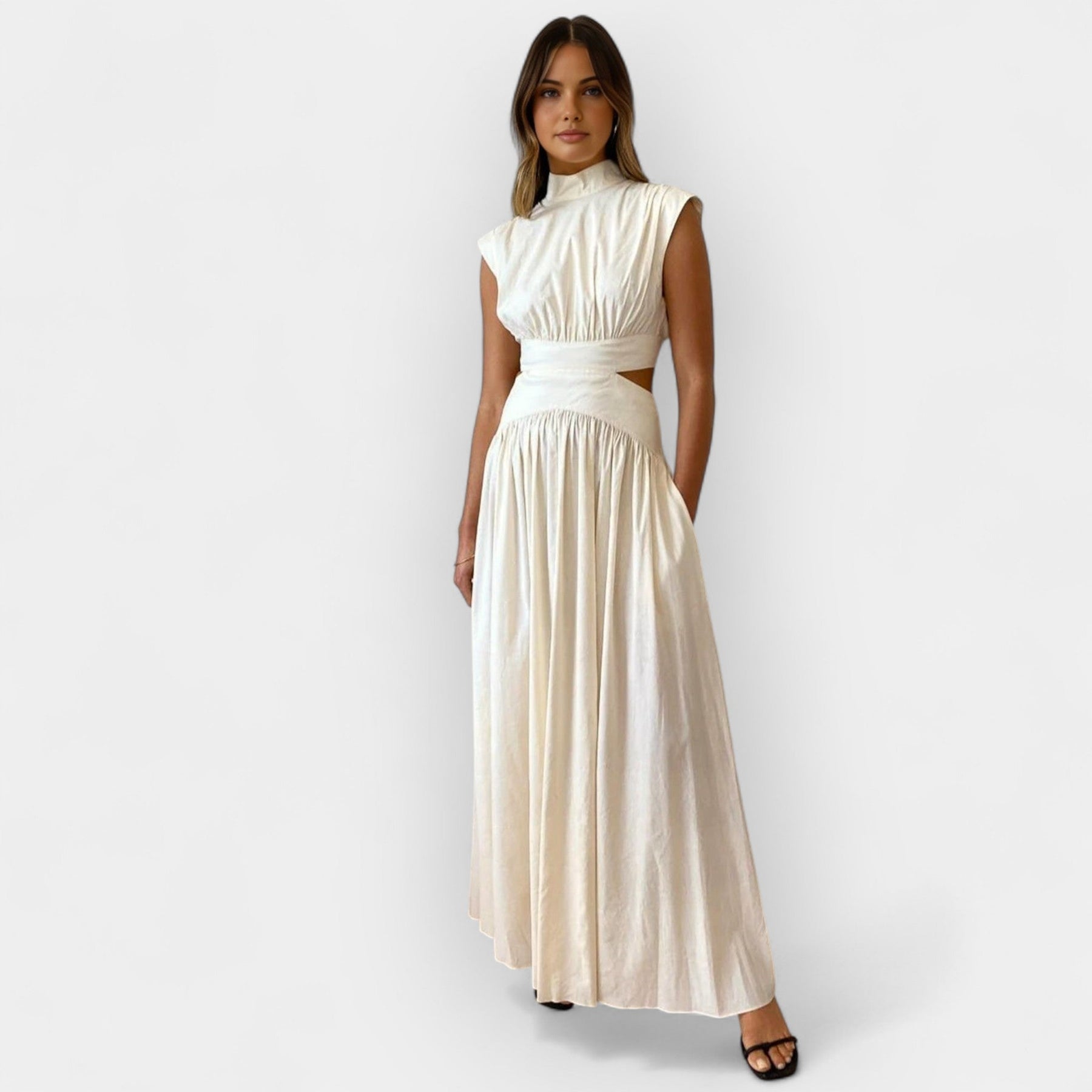 A stunning dress that combines a closed neckline with modern openings, creating a modern and feminine silhouette. Ideal for special evening looks with discreet boldness.
