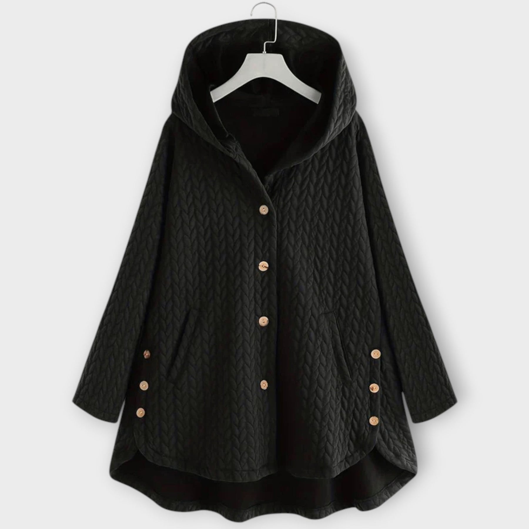 This comfortable and stylish jacket offers a relaxed, flowing fit perfect for easy layering during transitional weather. The entire body is detailed with a subtle textured quilting pattern, resembling braided cables. Large decorative buttons and a curved high-low hemline complete the unique, comfortable design.