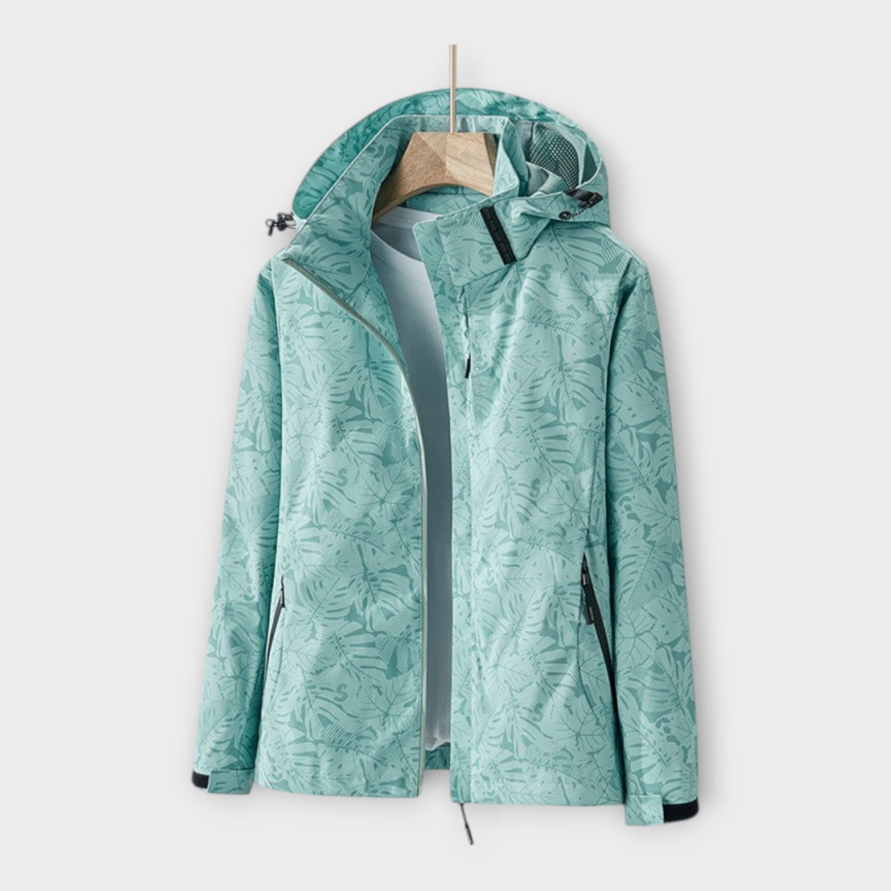 This practical jacket is designed for comfort and weather protection during outdoor activities. The material features a subtle, monochromatic botanical print that adds visual interest to the functional design. Adjustable drawstrings and sealed zippers ensure protection from wind and rain while maintaining a breathable, lightweight feel.