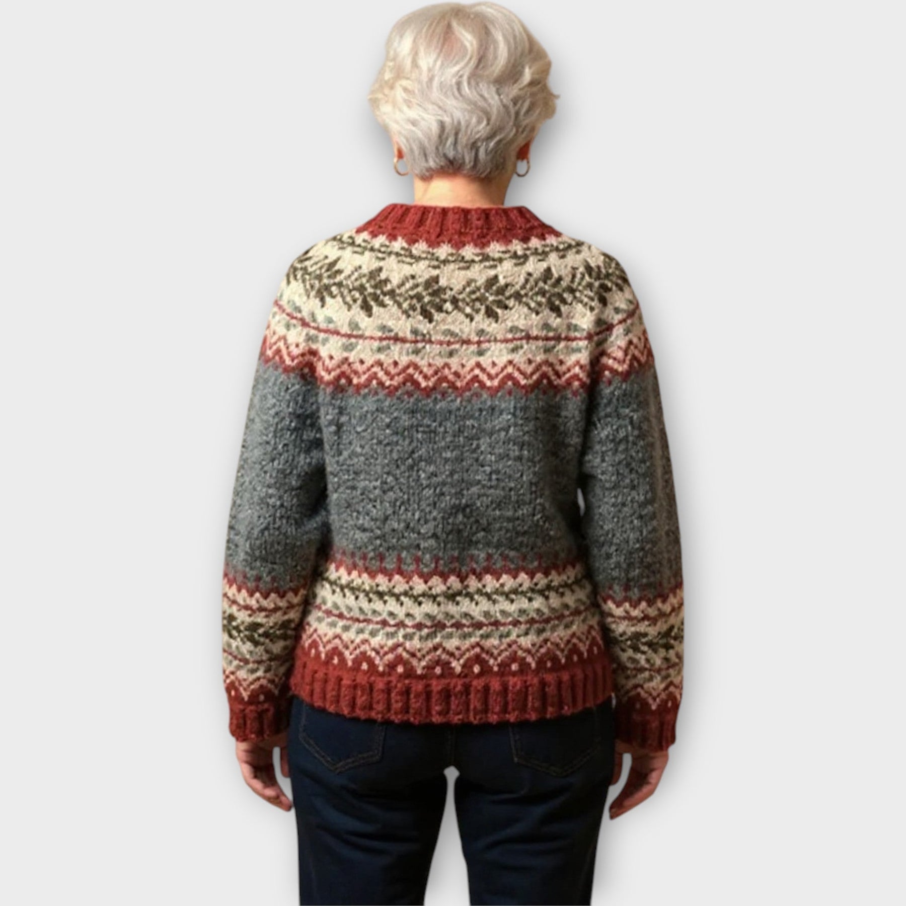 Embrace classic warmth and heritage style with this beautiful Fair Isle sweater. Featuring traditional geometric motifs in rich, earthy colors like terracotta, grey, and cream, this hand-knitted look piece is a timeless layering essential for the cold seasons.