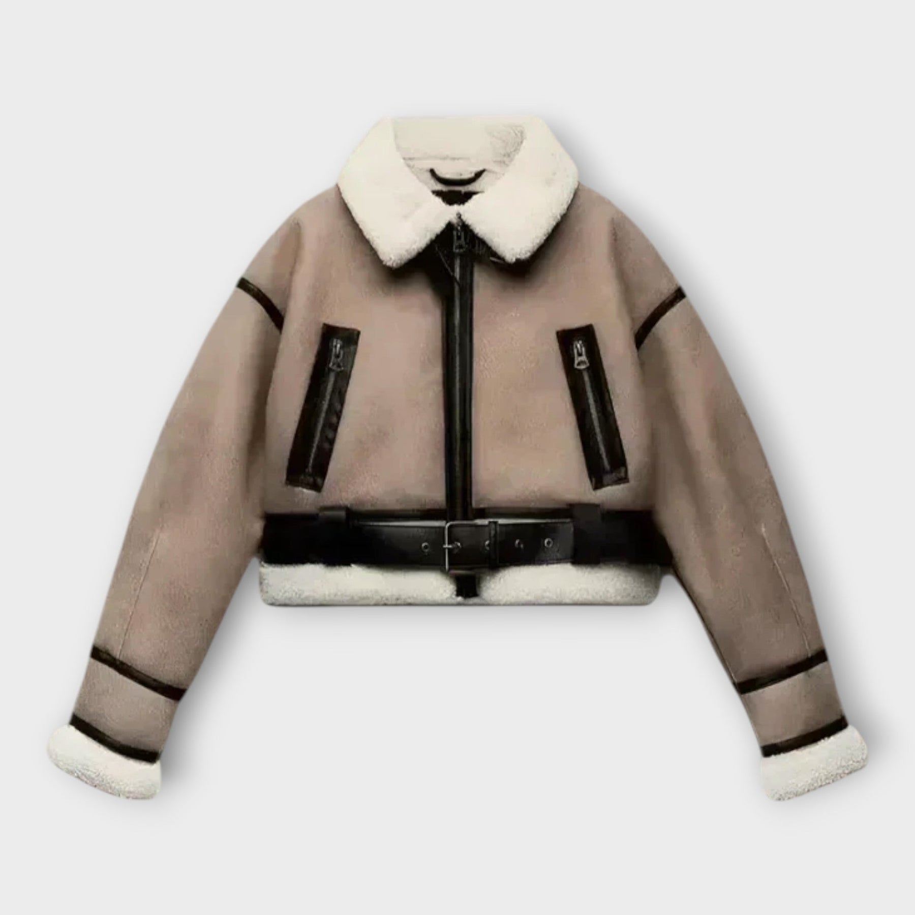 Elevate your cold-weather style with this fashionable aviator jacket. It features a soft suede-like exterior, cozy shearling lining and trim, and sharp black contrast detailing, creating a statement piece that is both warm and chic.